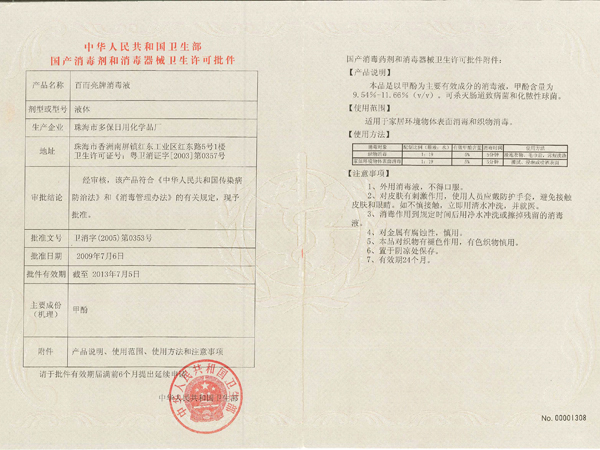 国产消毒剂和消毒器械卫生许可批件-百而亮牌消毒液