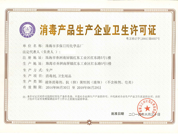 消毒产品企业卫生许可证