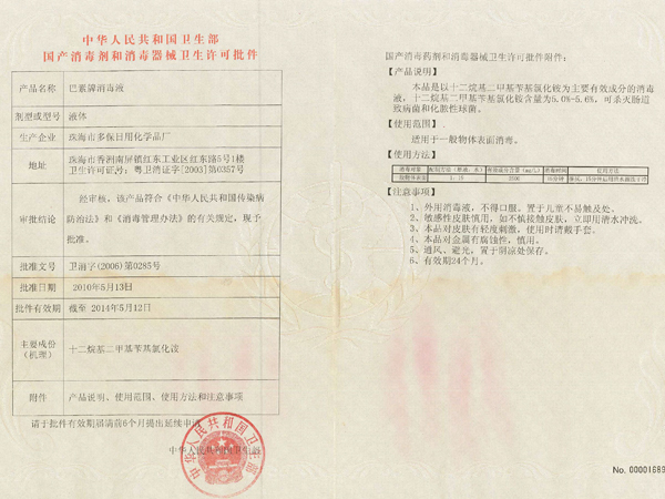 中国国产消毒剂和消毒器械卫生许可批件—巴素牌消毒液