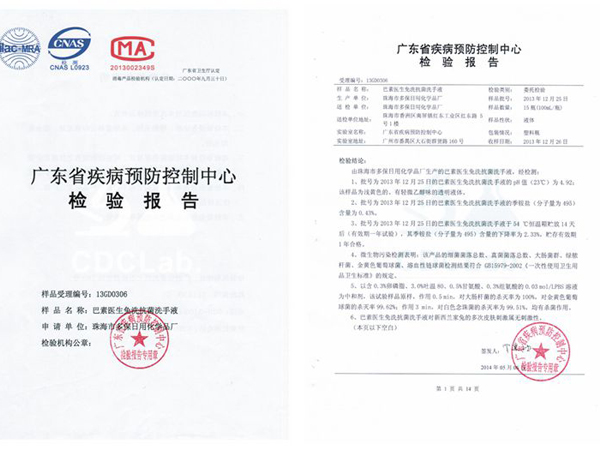 广东省疾病预防控制中心检验报告—巴素医生免洗抗菌洗手液