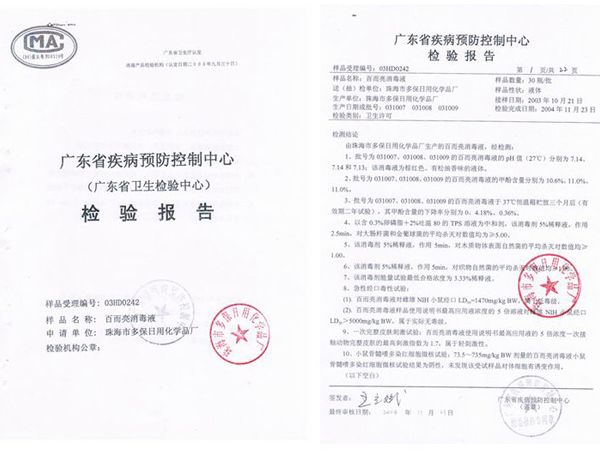 广东省疾病预防控制中心检验报告—百而亮消毒液